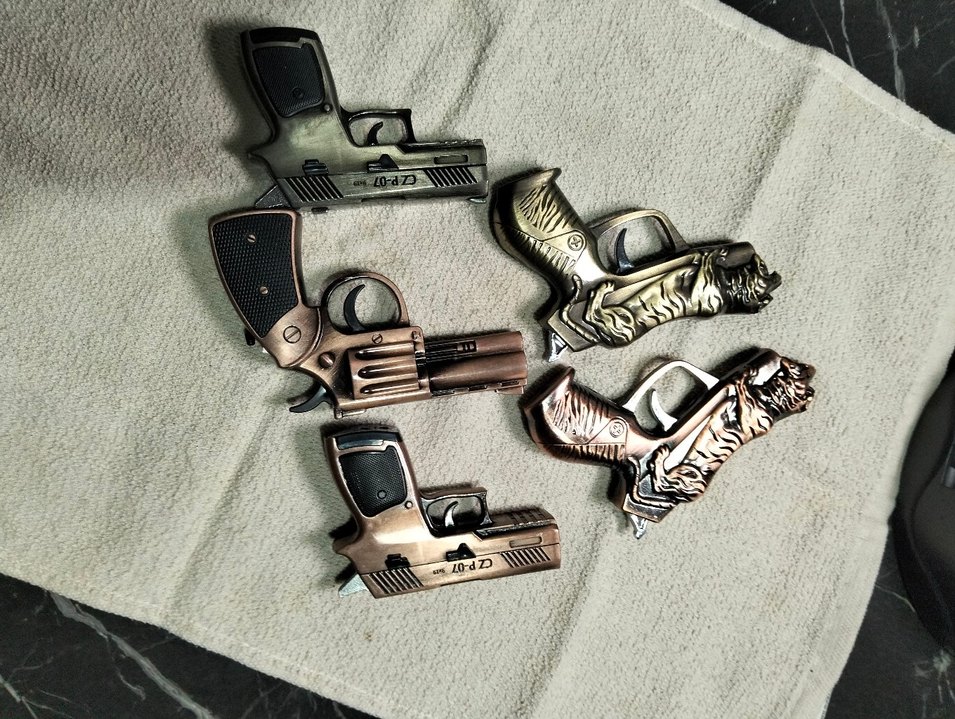Kahverengi ve metalik detaylara sahip renkli çakmak., farklı tasarımları ve detaylı kabzalarıyla çakmaklar. adet fiyatı 500 tl. dir.