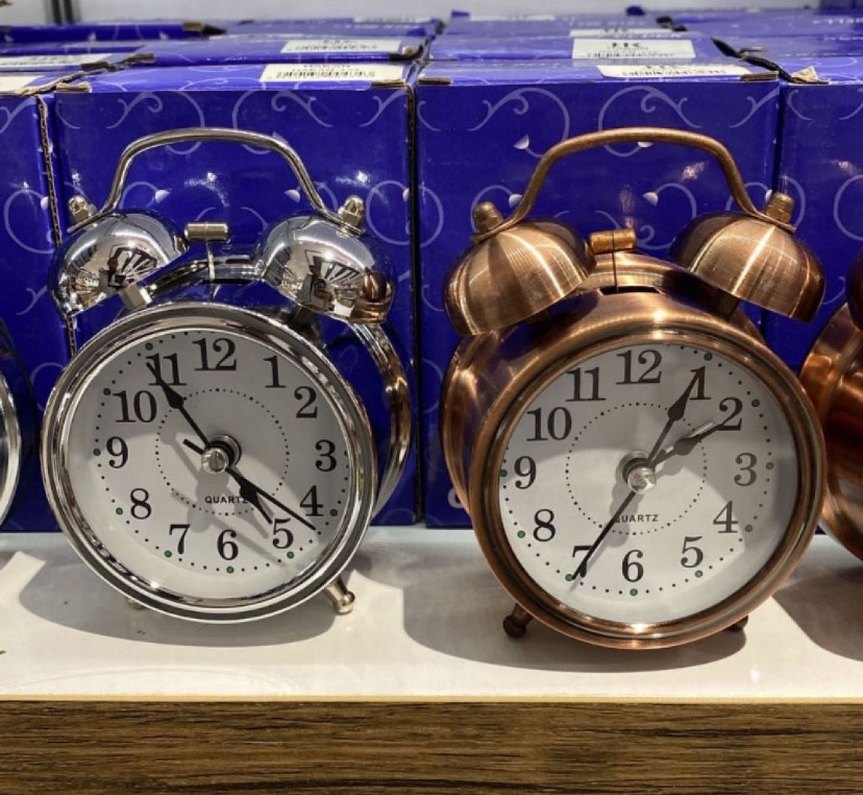 İkisi renkli metal çalar saat, net rakamlı kadran ve çift çanlı tasarım. Biri gümüş, diğeri bronz renkli. ️