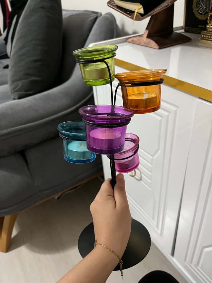 Beş renkli camdan oluşan, siyah metal ayaklı mumluk seti. Yeşil, turuncu, mor, mavi ve pembe renklerde.