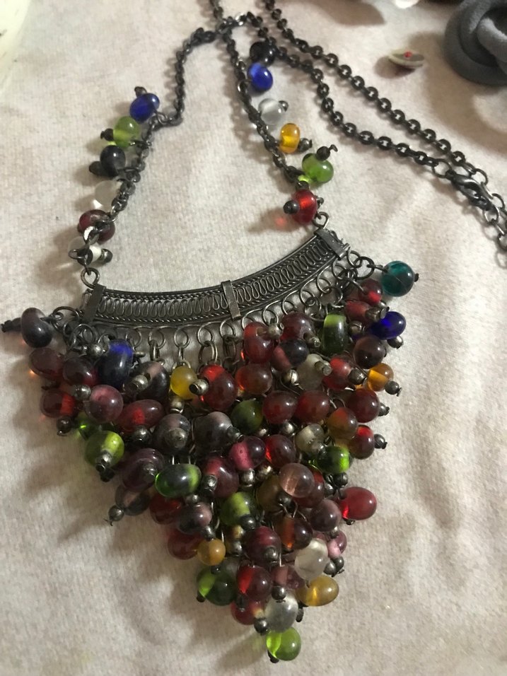 Uzun, desenli bohem kolye; koyu renkli çok renkli cam boncuklar(murano) ve metal zincirden oluşur, günlük kullanım için uygundur.