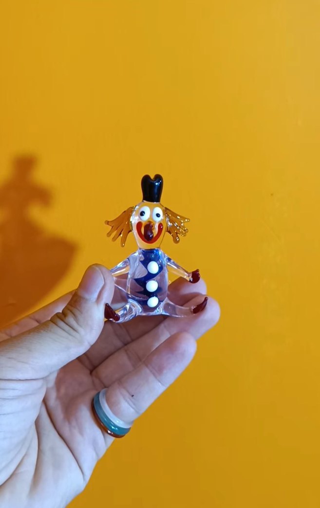 Detaylı yüz ifadelerine ve eğlenceli tasarıma sahip renkli cam palyaço figürin.