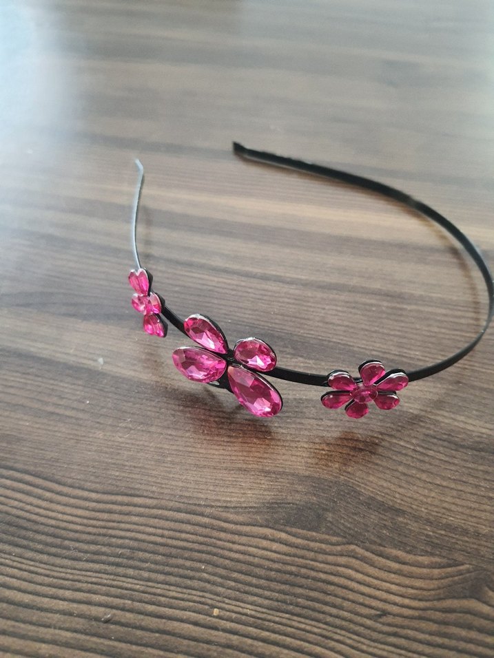 Minimalist tasarımlı, renkli cam taşlarla süslenmiş pembe çiçekli taç, bohem ve retro tarzlara uygundur.