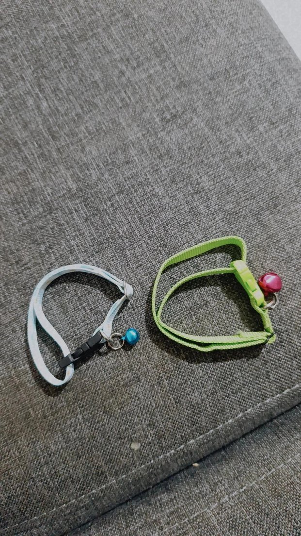 Mavi ve yeşil renklerde, küçük çanlı iki renkli kedi köpek boyun tasması.