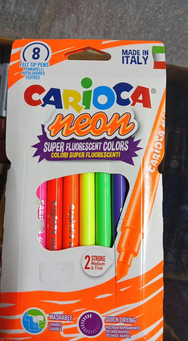 İtalya üretimi Carioca neon keçeli kalemler, 8 süper fluoresan renkte. Orta ve ince uçlu 2 stroke tasarıma sahip. ️
