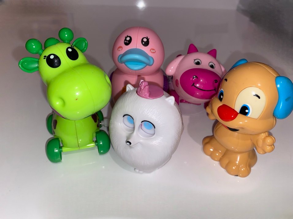 Yeşil kurbağa, pembe ördek, pembe domuz, beyaz tilki ve kahverengi köpekten oluşan renkli çek-bırak oyuncak hayvanlar. 6 oyuncak fiyata dahil.