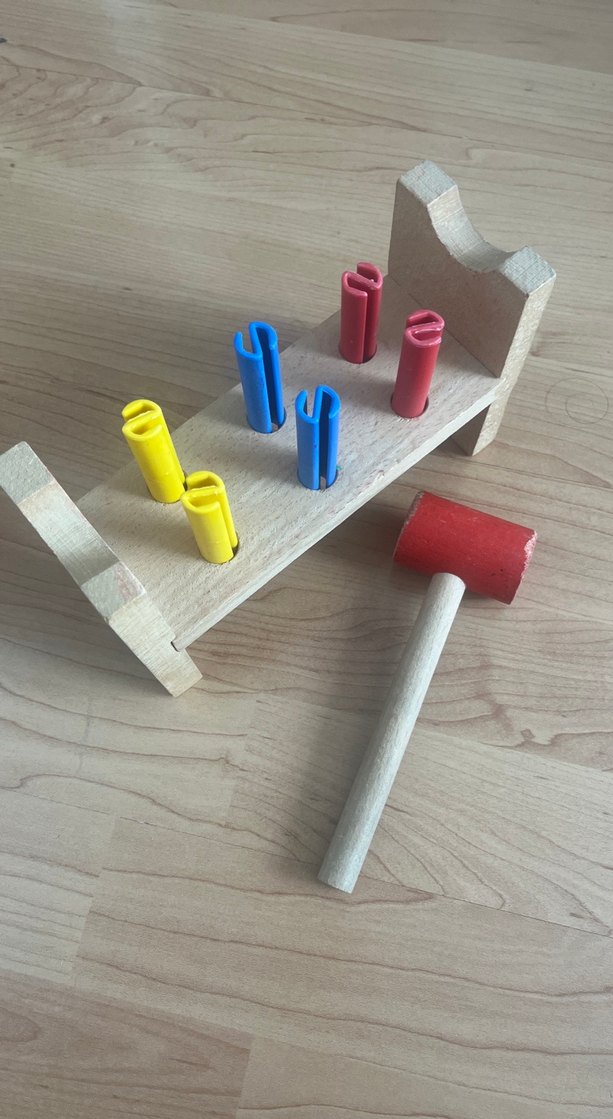 Renkli çiviler ve küçük bir ahşap çekiç içeren, el-göz koordinasyonunu geliştiren ahşap oyuncak. ️
