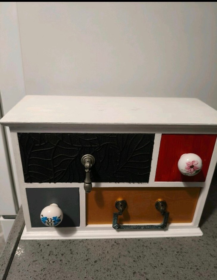 Beyaz çerçeveli, koyu tonlarda renkli çekmeceleri ve farklı dekoratif kulpları olan küçük çocuk dolabı.