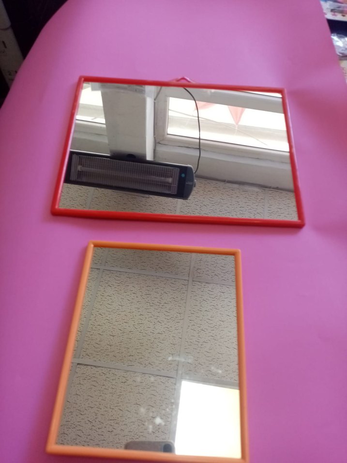 Canlı renklerde çerçeveleri olan pembe ve turuncu tonlarında duvar aynaları. Net yansıtma sağlar ve mekana renk katar. Büyük 150 Küçük 100 tldir