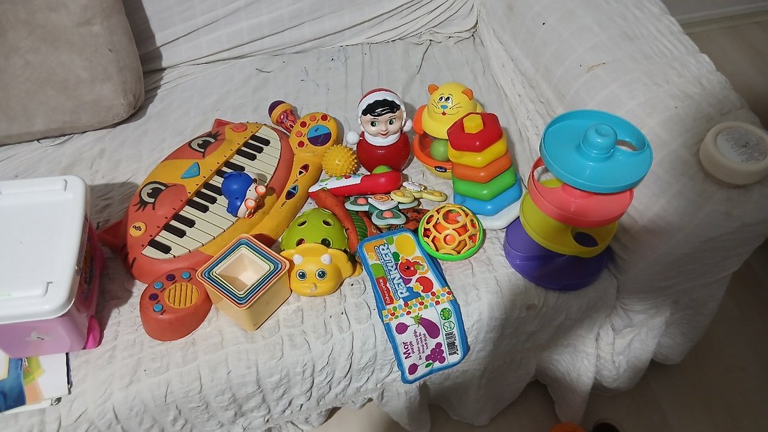 Yığın halkalar, çıngıraklar, oyuncak piyano ve hayvan figürleri içeren renkli bebek oyuncakları seti. Hepsi çok iyi durumda Çocuklarım hepsi ile sefe seve ounadı