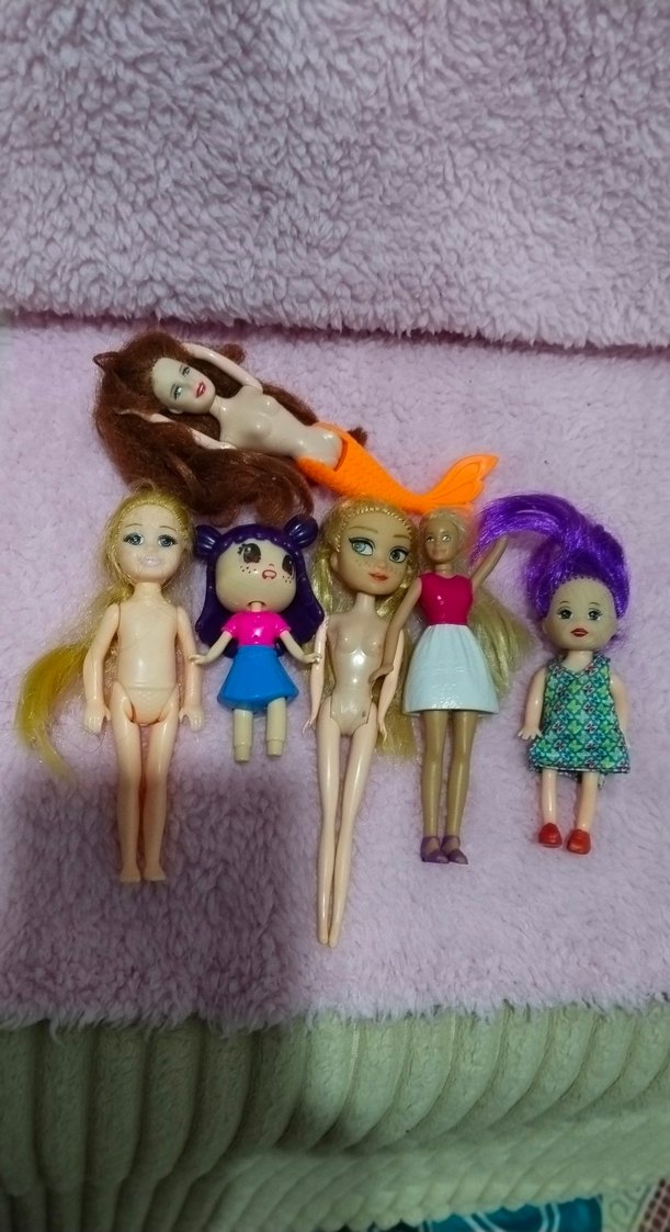 Farklı boy ve saç stillerine sahip, renkli saçlı bebeklerden oluşan bir set. Denizkızı bebeği de bulunur. hepsinin fiyati