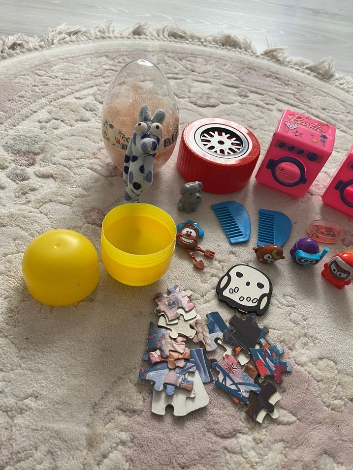 Puzzle parçaları, küçük figürler, taraklar ve kaplar içeren renkli çeşitli çocuk oyuncakları.