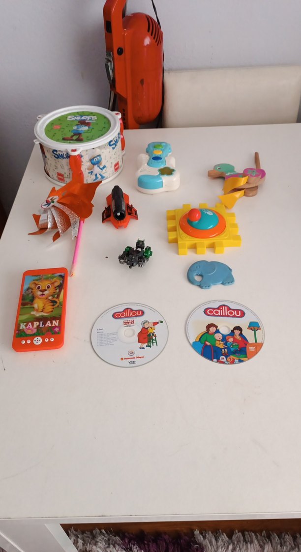 "KAPLAN" yazılı oyuncak telefon, hayvan figürleri, küçük davul ve Caillou DVD'leri içeren renkli çeşitli oyuncaklar. gitar ve oyuncak telefon çalışıyormu bilmiyorum