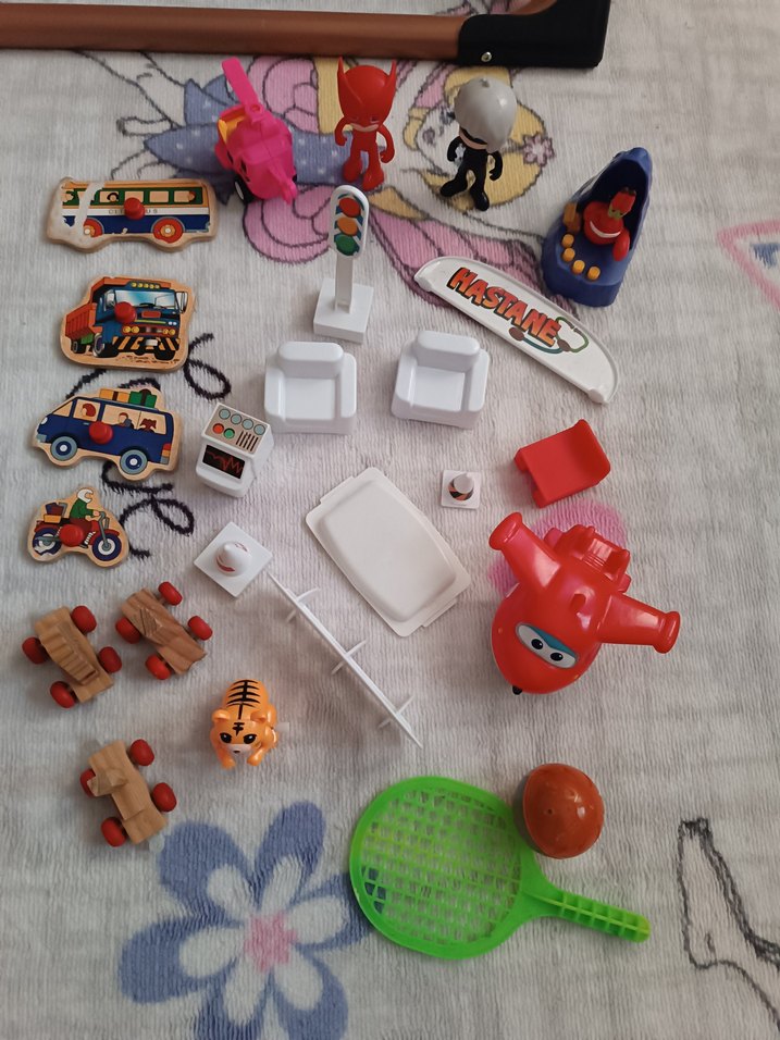Araçlar, hayvanlar ve oyun aksesuarları içeren renkli çeşitli küçük oyuncak seti.