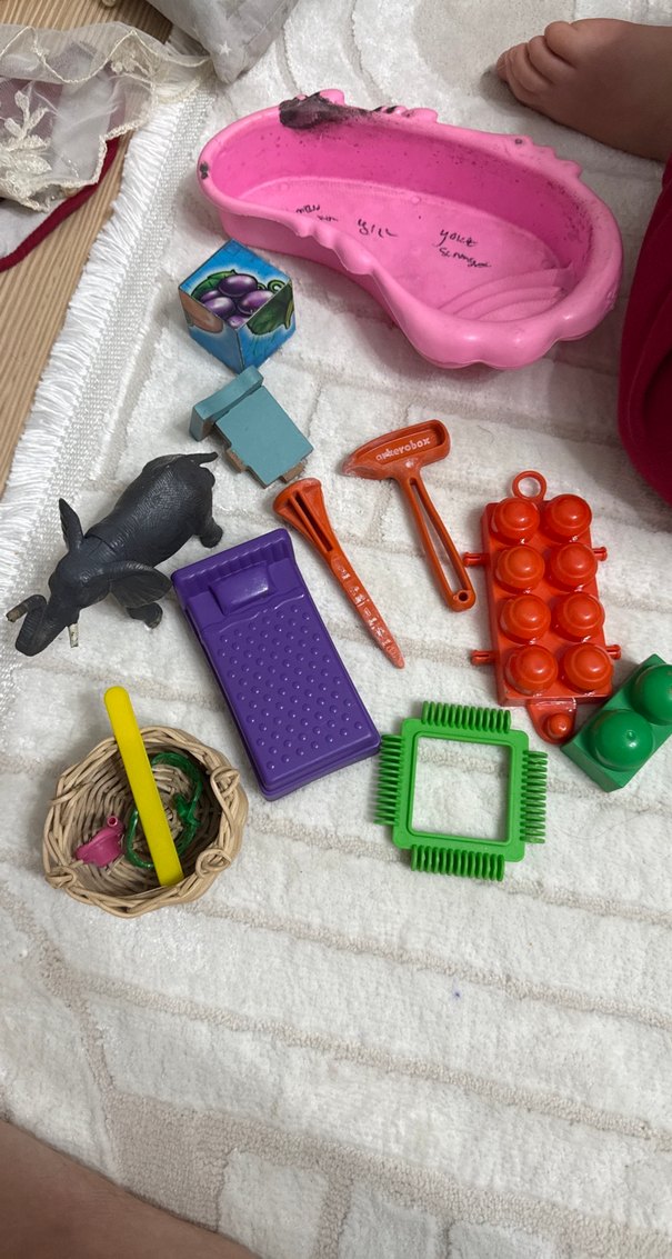 Küçük pembe havuz, siyah hayvan figürü ve çeşitli şekil ve renkte plastik aksesuarlar içeren renkli oyuncak seti.