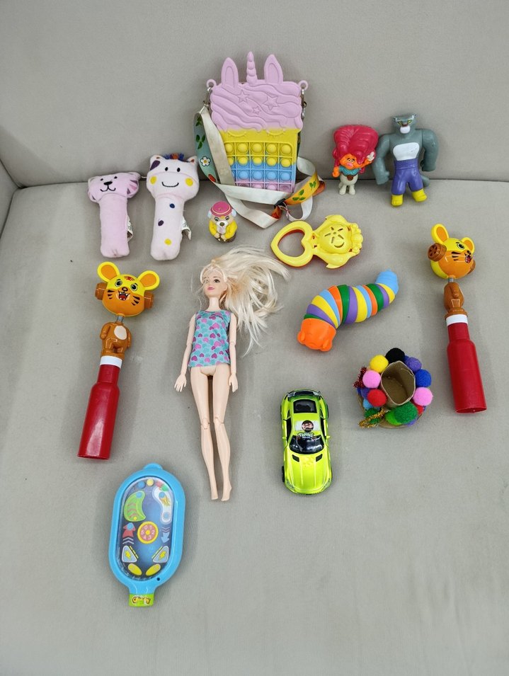 Bebek, oyuncak araba, hayvan figürleri, unicorn pop-it çanta ve el oyuncaklarından oluşan renkli oyuncak seti. Hayal gücünü destekler. 14 parça oyuncak..cocuklarım büyüdüğü için satıyorum..hepsinin toplam değeri ayrı ayrı 2000 tl yi geçiyor..