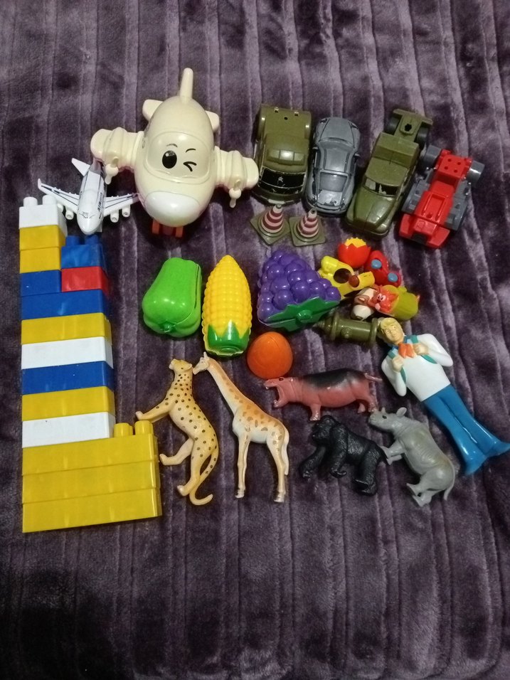Araçlar, hayvanlar, meyveler ve bloklardan oluşan renkli çeşitli oyuncak seti. Hayal gücünü ve öğrenmeyi destekler.