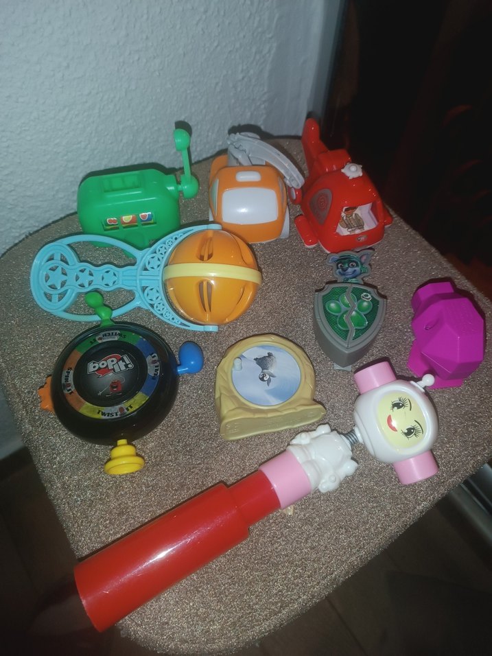 Çeşitli küçük oyuncakların renkli seti, dönen top, oyuncak helikopter ve farklı canlı renklerde oyun eşyaları içerir.