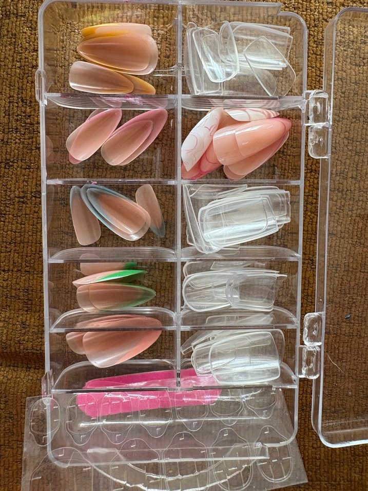 Farklı şekillerde ve açık tonlarda renkli takma tırnaklar, şeffaf kutuda düzenlenmiş. Pembe tırnak törpüsü ve yapıştırıcı bant. Renkli french şeffaf ve çizgili french tırnaklar toplam hepsinin fiyatıdır.