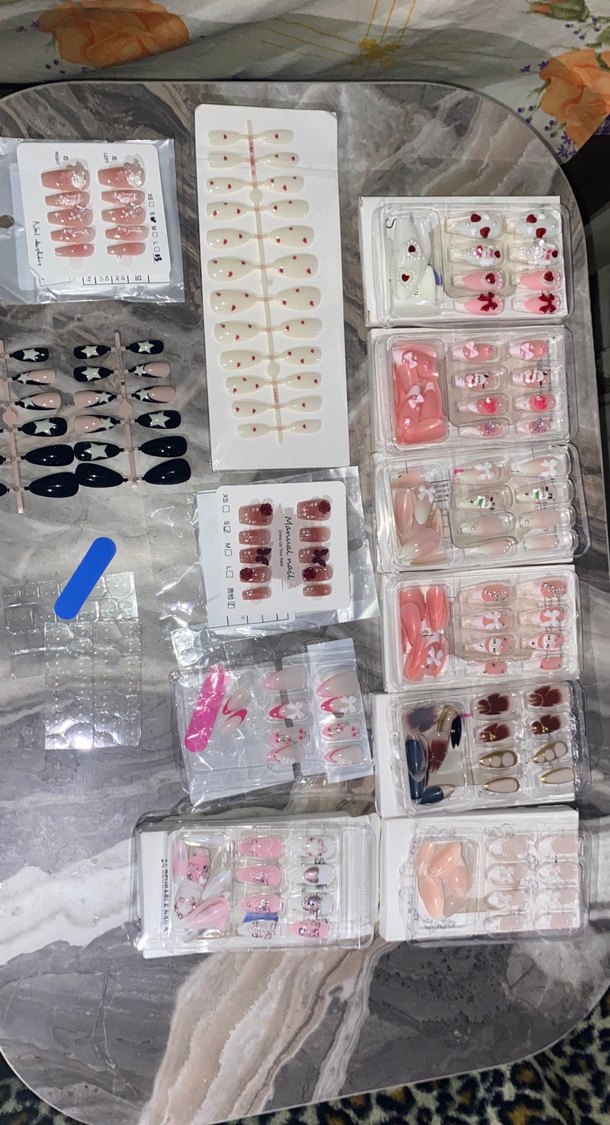 Çeşitli desen ve şekillerde, renkli ve canlı tırnak süslemeleri seti. Farklı stiller için açık ve çok renkli seçenekler içerir. Tane fiyatıdır fiyat sorunuz