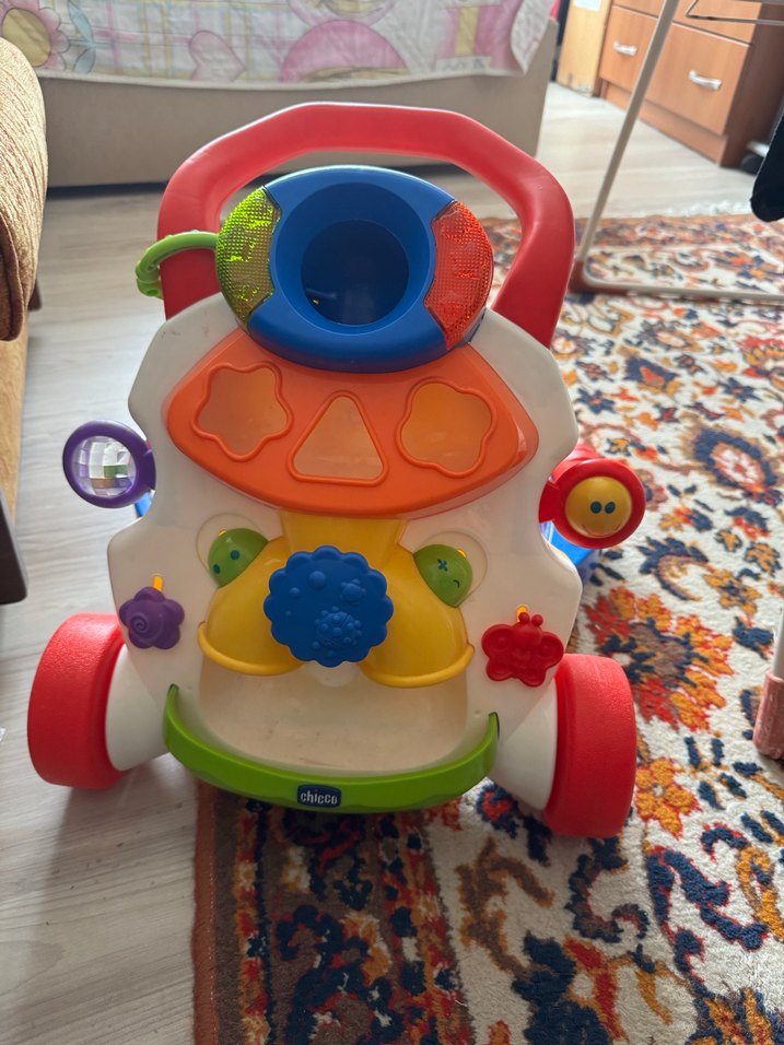 Renkli Chicco bebek yürüteci, etkileşimli düğmeler ve şekillerle oyun sağlar. Sağlam kırmızı tekerlekleri ve rahat tutma sapı vardır. cok temiz ve az kullanılmıs durumda oldugu için bu fiyattırpilli calısır durumda sadece içine atılan tıp üçgen leri eksik freni var bu fiyata asla kaçmaz