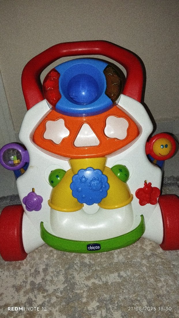 Renkli Chicco bebek yürüteci, destek için sağlam tutacak ve interaktif oyuncaklar içerir. Bebeklerin yürümeyi eğlenceli şekilde öğrenmesine yardımcı olur.