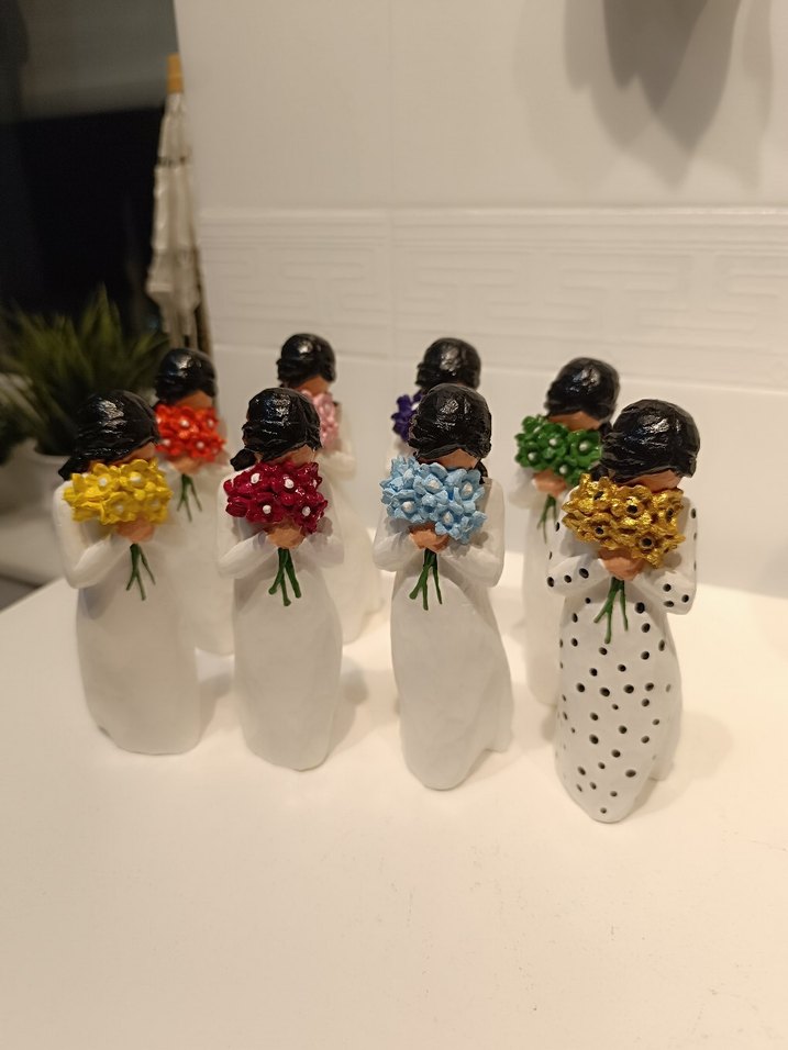 Renkli çiçek buketleri tutan kadın figürleri. Her biri farklı renkte çiçeklere sahip ve beyaz kıyafetli, siyah saçlıdır.