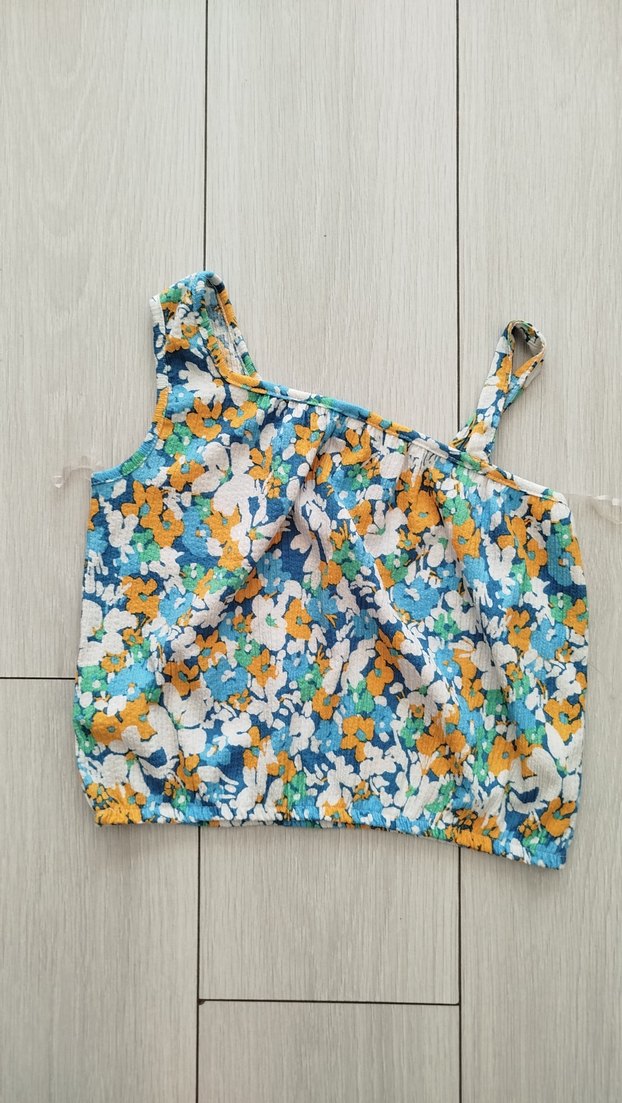 Renkli çiçek desenli, askılı ve volan detaylı, bol kesim mini bluz. Bohem tarz için uygun, dış mekan kullanımı için ideal. Hiç giyilmedi.