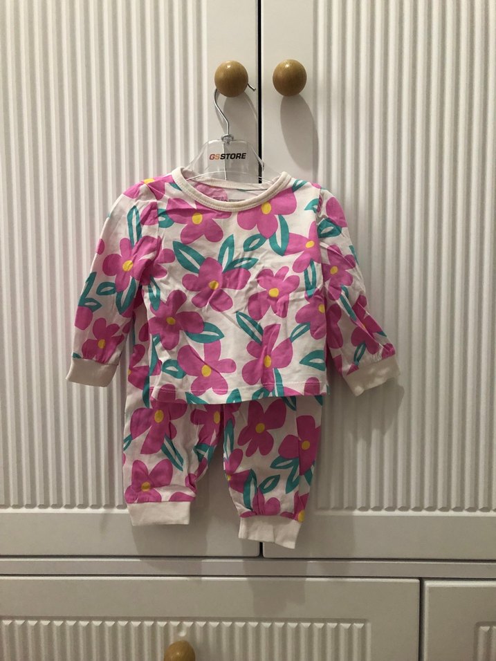 Uzun kollu, düğmeli renkli bebek kız takımı, canlı pembe çiçek desenleriyle süslenmiştir.