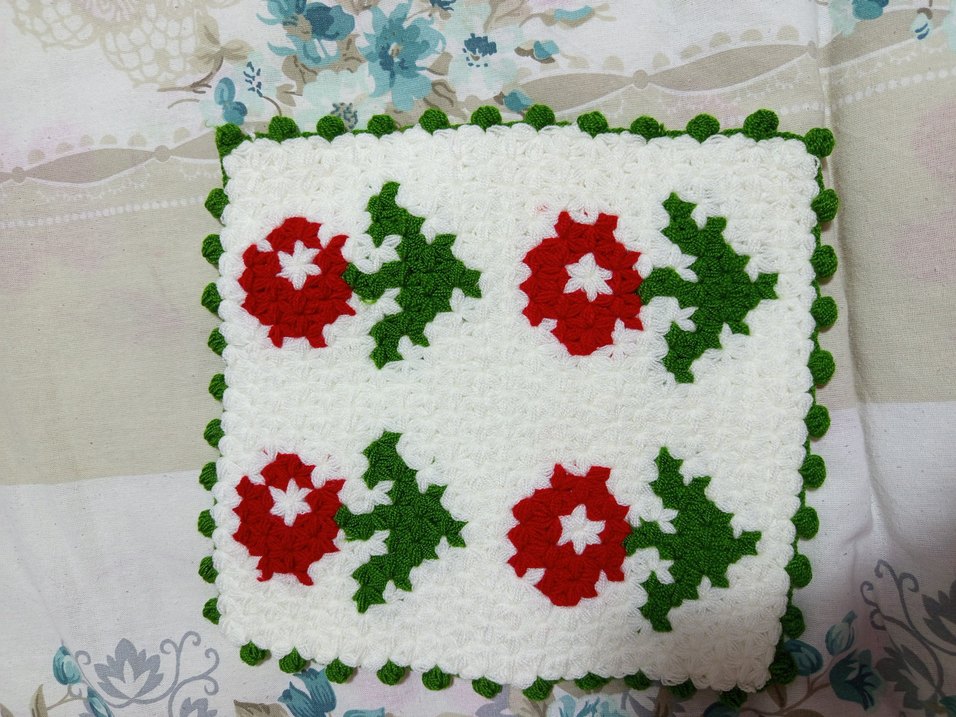 Renkli kırmızı ve yeşil çiçek desenli beyaz banyo süngeri, el yapımı tığ işi tasarım. Yumuşak dokulu, nazik kullanım için.