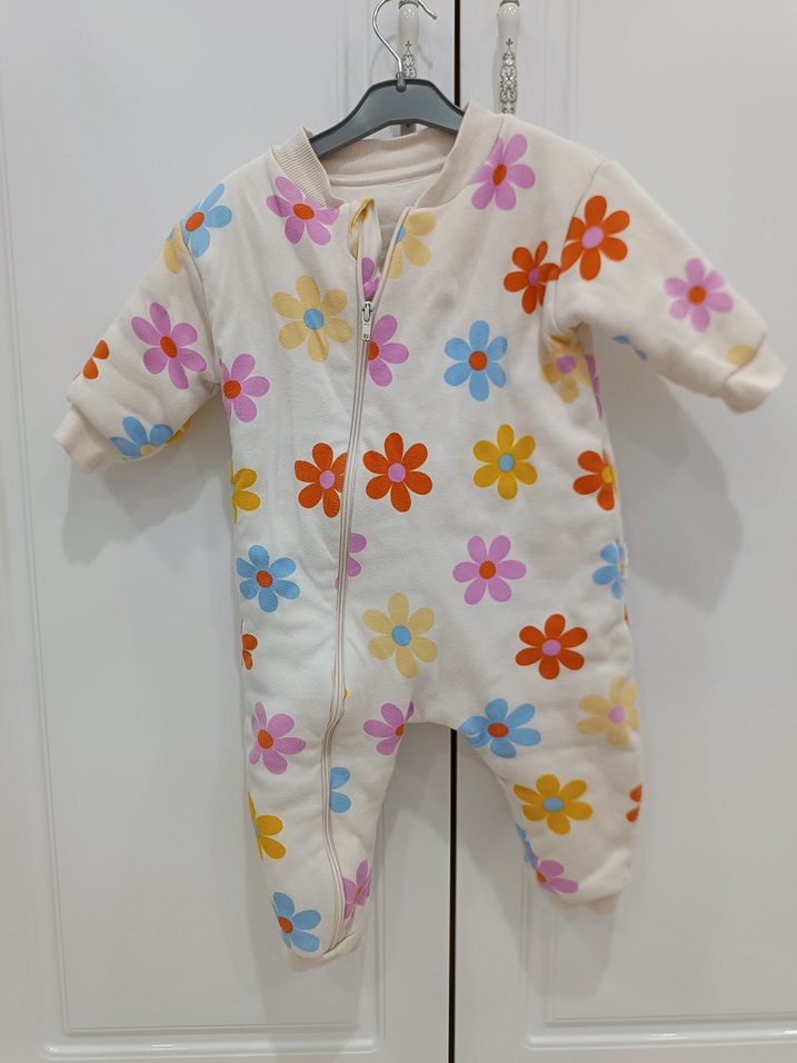 Renkli çiçek desenleriyle süslenmiş beyaz bebek tulumu, önünde kolay giyilip çıkarılabilen fermuarlı tasarıma sahiptir. Yumuşak ve rahat kumaştan üretilmiştir.
