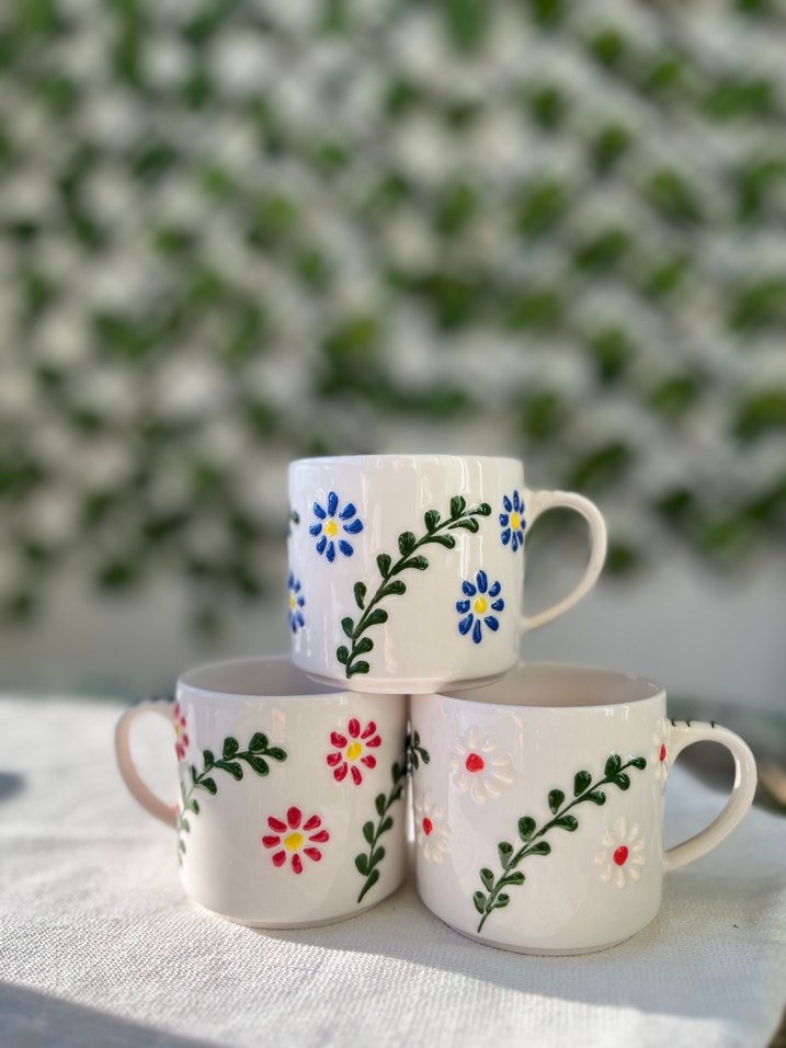 Marka Temsili. Renkli çiçek desenleri ve yeşil yaprak detaylarıyla beyaz seramik kupalar, sıcak içecekler için uygun. ☕