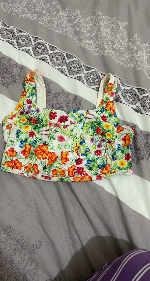 Renkli çiçek desenli, kolsuz ve vücuda oturan bu bohem tarz büstiyer, fırfır detaylarıyla dikkat çekiyor. s xs uyumlu