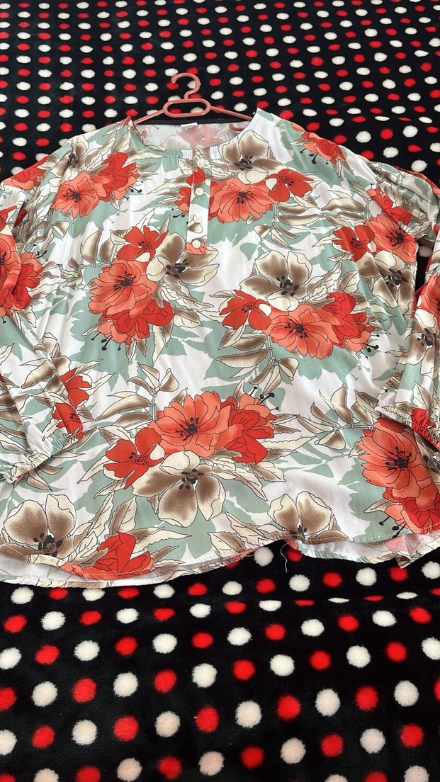 Renkli çiçek desenli, düğmeli, bol kesim uzun kollu ve kayık yakalı bluz. Yumuşak sentetik kumaştan, bohem tarz için uygun.