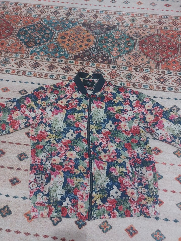 Renkli çiçek desenli, bol kesim, uzun kollu kadın ceket. Yuvarlak yaka ve fermuarlı önü ile günlük kullanıma uygun bohem tarzda.