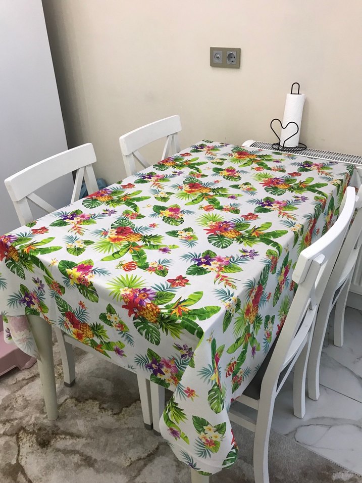Beyaz masa örtüsü, renkli çiçek desenleri ve bohem tarzıyla yemek alanınıza canlılık katıyor. 150x150cm jarse leke tutmaz sofra bezi masa örtüsü Sıfır ürün