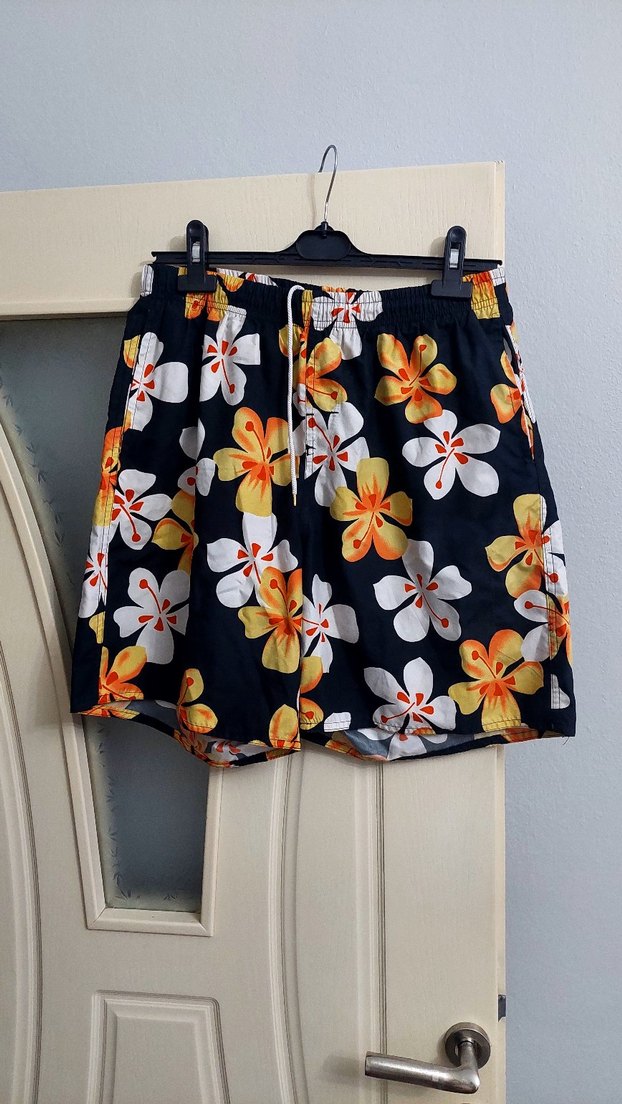 Çok az kullanılmış tertemiz L 40 beden cepli,beli lastikli bağcıklı erkek deniz şortu Bol kesimli, renkli çiçek desenli ve kemerli erkek şort, rahat ve şık bir plaj kombini sunar.