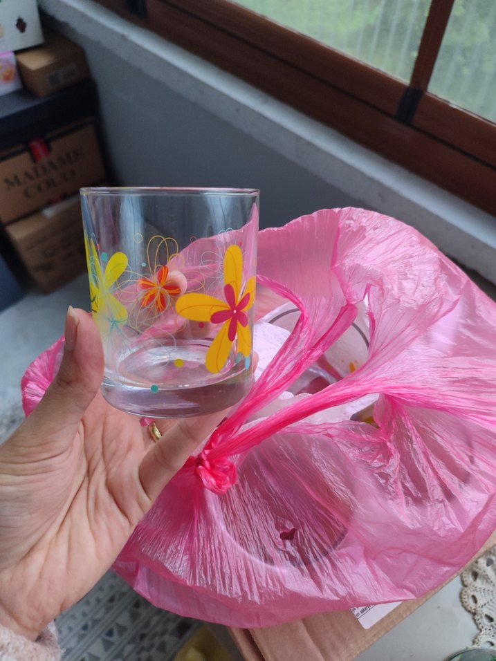 Renkli çiçek desenleriyle süslenmiş şeffaf cam bardak, içeceklerinize neşe katar. 6 adet