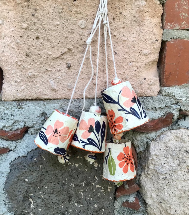 Pembe ve turuncu çiçek desenli, beyaz tabanlı renkli seramik sarkaçlar. Beyaz iplerle asılır, ev dekoruna canlılık katar. Dört adet çan formunda süs. Boncukları dekoratiftir ses çıkarmaz
