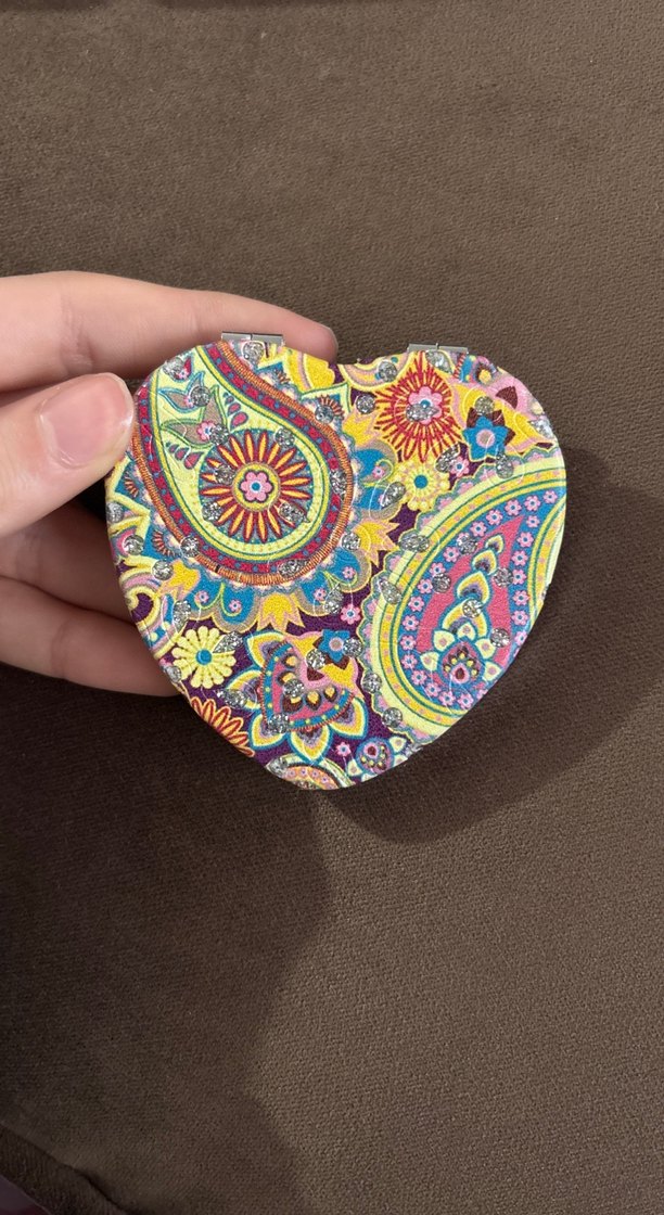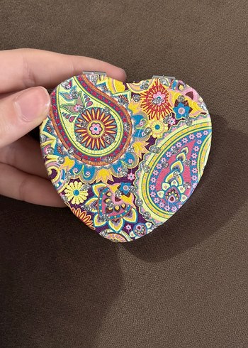 Kalp şeklinde, renkli çiçek ve paisley desenli, boncuk detaylı ayna. Bohem tarzını yansıtır.