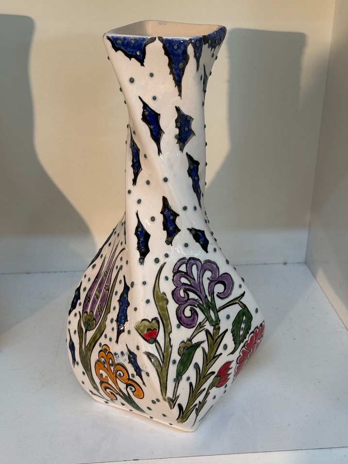 Bu seramik vazo, beyaz zemin üzerinde mavi, mor, turuncu ve yeşil tonlarda renkli lale karanfil desenlerine sahiptir. Her aşaması el işidir 30 cm civarındadır