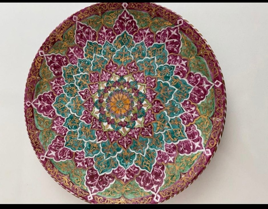 Koyu çok renkli çiçek desenine sahip, detaylı ve canlı renklerin kullanıldığı dekoratif tabak. Mekâna sanatsal bir hava katar.