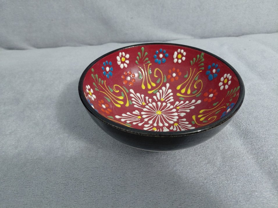 El yapımı seramik kase, kırmızı zemin üzerine renkli çiçek desenleriyle süslenmiştir. Geleneksel tasarım ve canlı renkler bir arada.