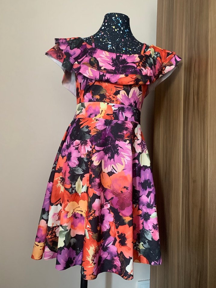 Renkli çiçek desenli midi elbise, straplez yaka ve fırfır detaylı. Yaz akşamları için Cıvıl Cıvıl, hiç giymedim