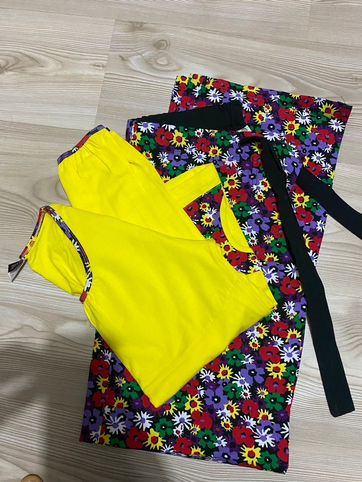 Rahat kesim, çok renkli çiçek desenli eşofman altı ve cırt cırtlı, askısız sarı üstten oluşur. Trend sokak modası için uygundur.