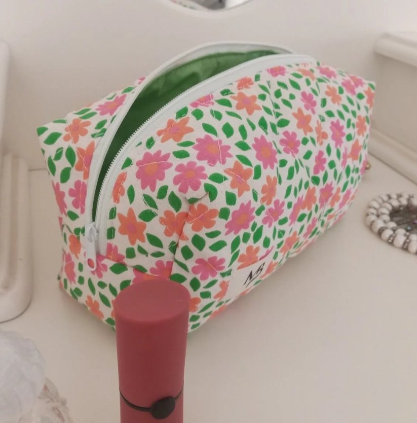 Sentetik kumaştan yapılmış, renkli çiçek desenli ve fermuarlı, günlük kullanıma uygun makyaj çantası.