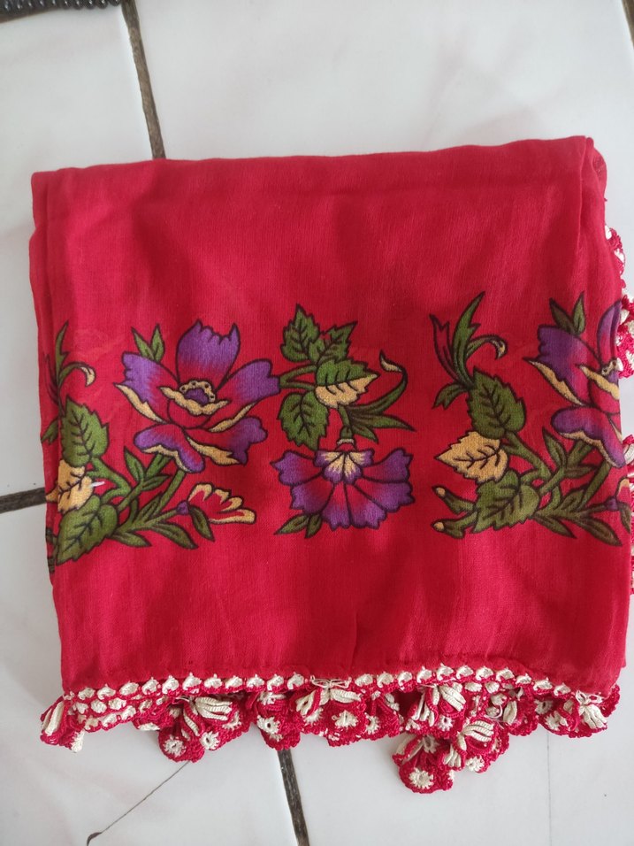 Renkli çiçek desenli, fırfırlı kenarlara sahip kırmızı tekstil kadın fuları.