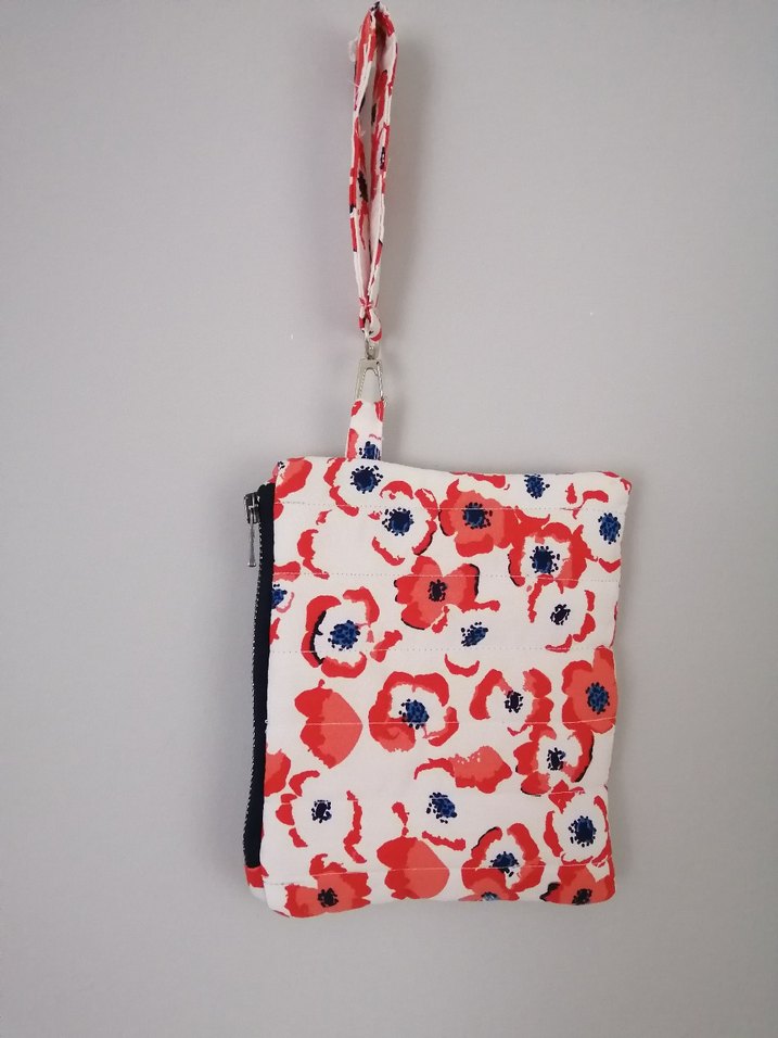 Renkli çiçek desenine sahip, fermuarlı ve bileklik askılı pamuklu kumaş makyaj çantasıdır.