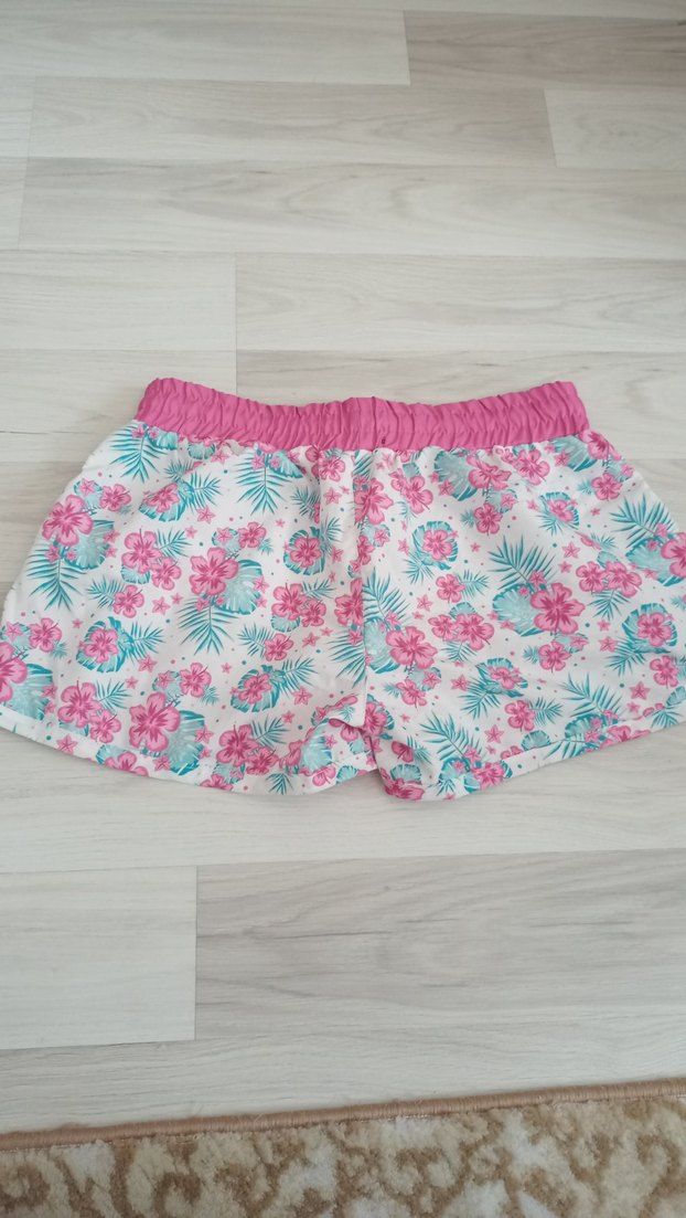 Pembe bel bantlı, ayarlanabilir bağcıklı renkli çiçek desenli kadın plaj şortu. Rahat ve günlük plaj kullanımı için uygun.