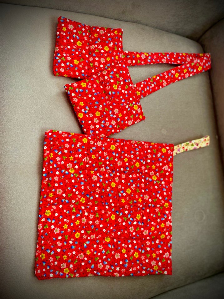 Renkli çiçek desenli kırmızı mutfak gereç Çaydanlık ve tencere altı olarak kullanılıyor Tutacak ile ikili takımdır Kendi el emegimdir