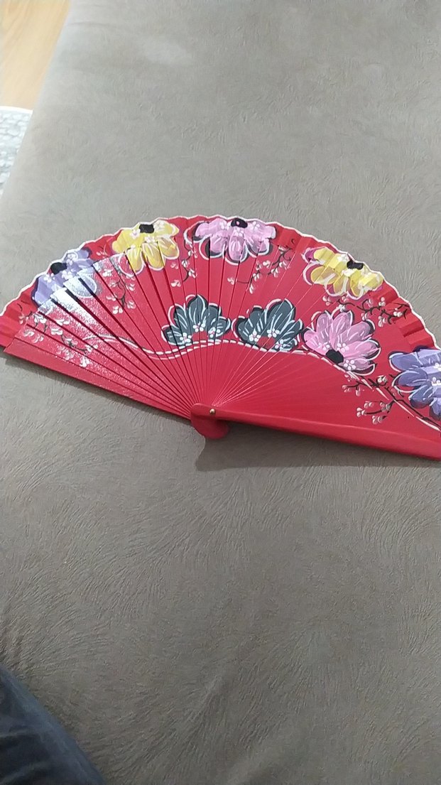 Kırmızı yelpazede sarı, pembe, mor ve yeşil çiçek desenleri bulunur, canlı ve dekoratif bir görünüm sunar.